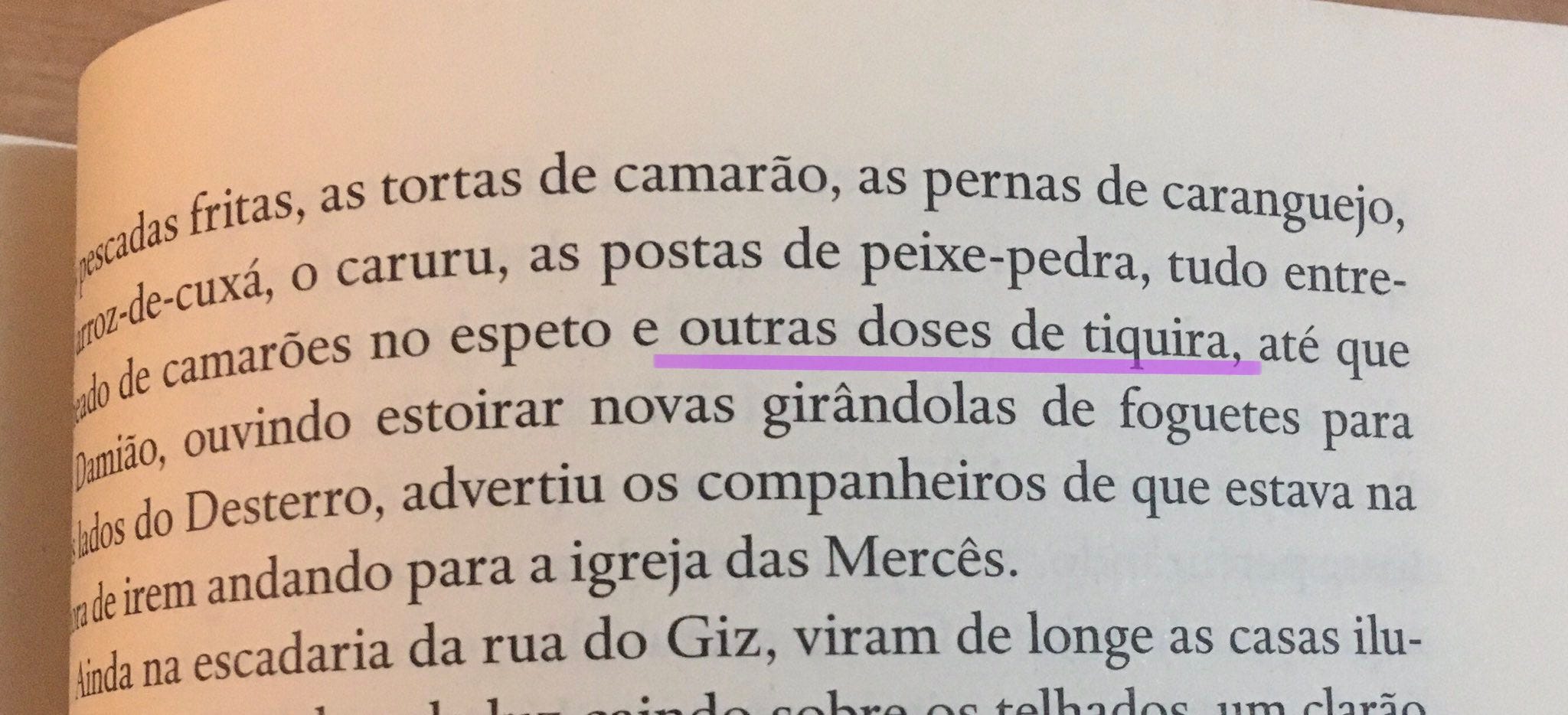 Por entre discursos exaltados, uns do João Moura, outros do Aluísio Porto, e outros mais do Antônio Lobo, vieram às mesas as pescadas fritas, as tortas de camarão, as pernas de caranguejo, o arroz de-cuxá, o caruru, as postas de peixe-pedra, tudo entremeado de camarões no espeto e outras doses de tiquira, até que o Damião, ouvindo estoirar novas girândolas de foguetes para os lados do Desterro, advertiu os companheiros de que estava na hora de irem andando para a igreja das Mercês. (p. 619)
